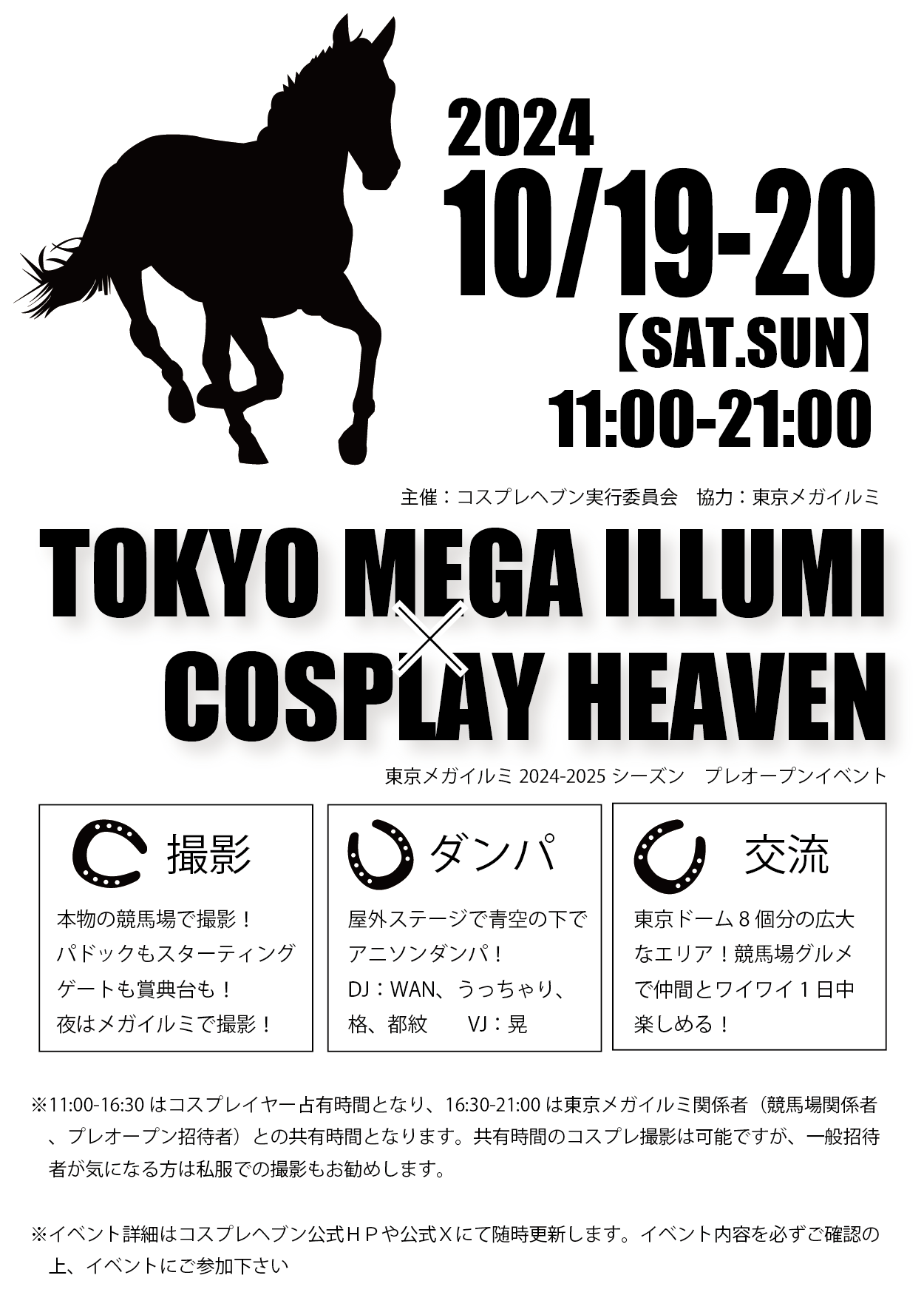 本物の競馬場がコスプレ会場に!競馬場ならではの広大なエリア(東京ドーム8個分!)で撮影も交流も1日中楽しめる!昼間は競馬場ならではのロケーションを、日没後はイルミネーション輝く幻想的な世界(東京メガイルミ)を背景に『ココだけの写真』を撮ろう!日中は屋外ステージでダンパも開催!最高に盛り上がります!