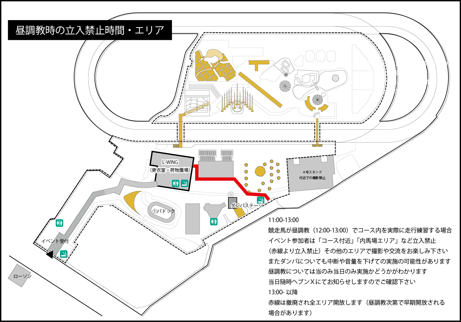 ・競馬場使用イベントとして「馬の昼調教時」には立ち入り禁止時間+エリアがあります